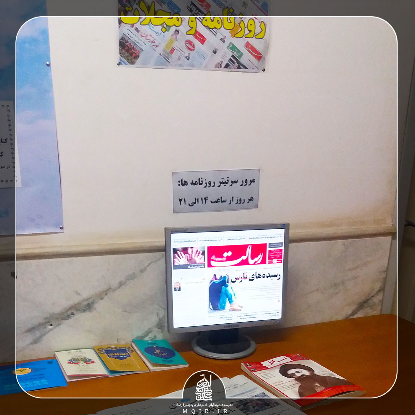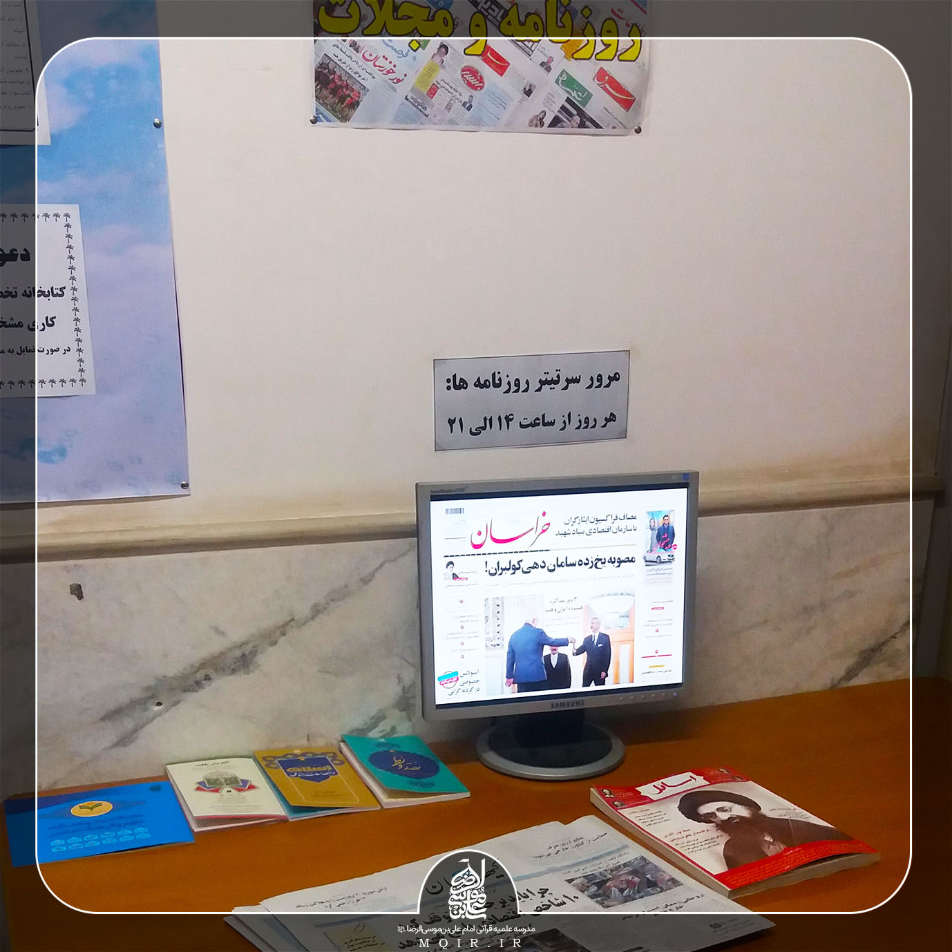 به روز بودن طلاب یکی از شاخصه های موفقیت آن ها می باشد و برای تحقق این ویژگی بین طلاب مدرسه علمیه قرآنی امام علی بن موسی الرضا(علیه‌السلام)، فضایی برای مشاهده صفحه اول روزنامه های کشور و به روزترین مجلات علمی قرار داده شده است تا طلاب با قرار دادن کمترین زمان بتوانند بیشترین بهره را ببرند و خود را از نظر علمی و اجتماعی به‌روز نگه دارند.