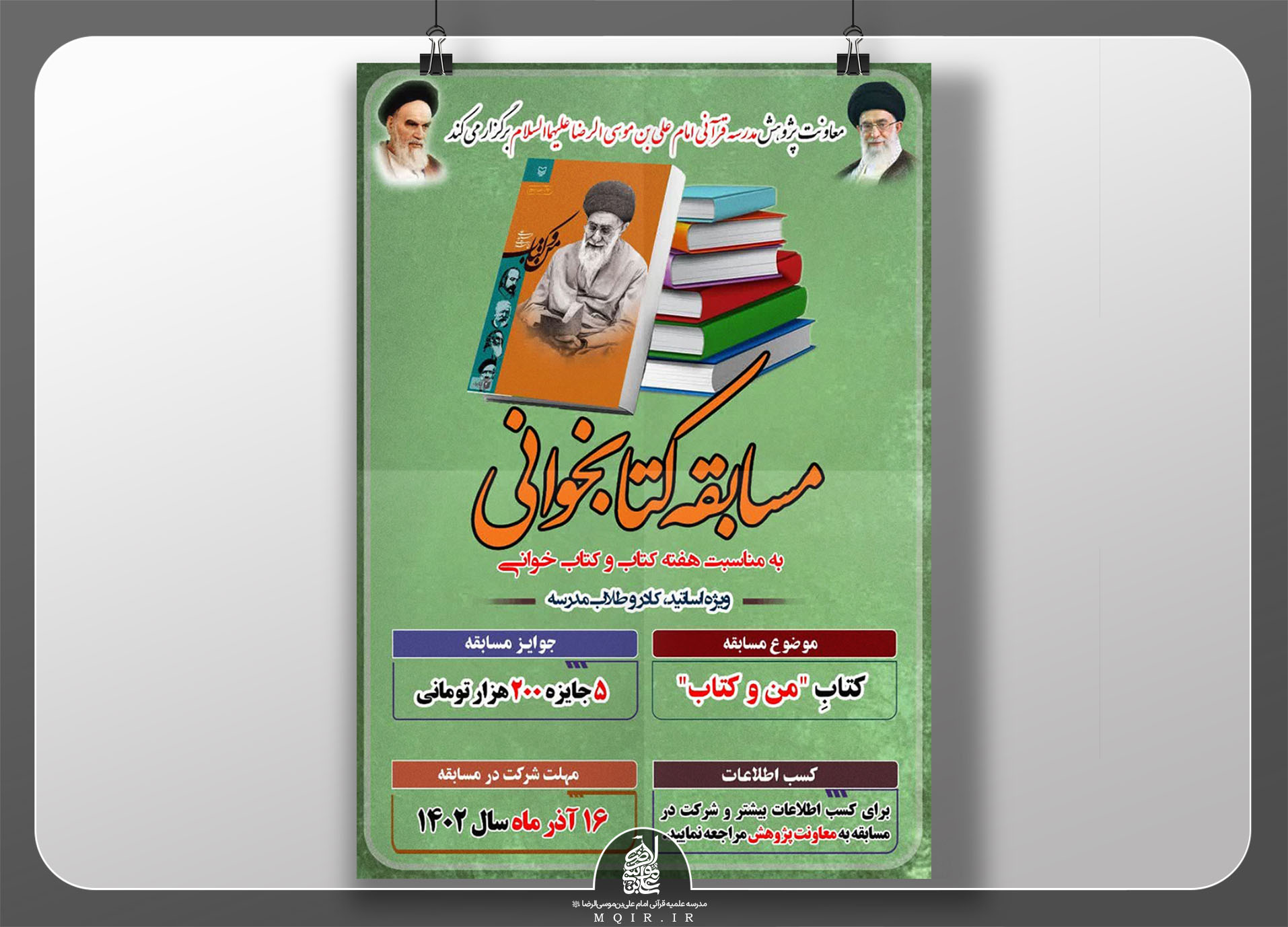 کتاب های " من و کتاب " با موضوع سخنرانی ها و خاطرات حضرت آقا(حفظه‌الله) و " رقصیدن این چنین میانه میدانم آرزوست " با موضوع دلاوری های شهید چمران در عملیات سوسنگرد از جمله کتاب هایی است که از آن‌ها مسابقه برگزار شده است.